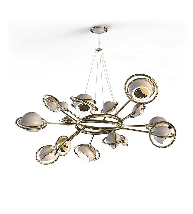 A second kids room follows a similar neutral-meets-neon palette, only this time with a space theme. Amazing pendant light shades float like UFOs.
