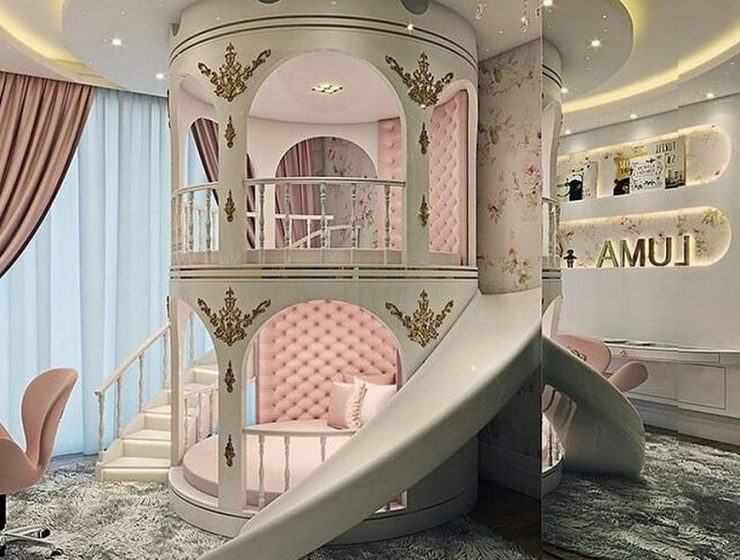 This bedroom, by an unknown author, proves how much a girl’s bedroom can be creative, and keep the childish aura together alongside modern and luxurious accents. The bunny head headboards…