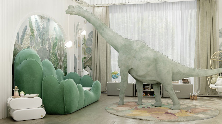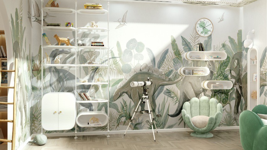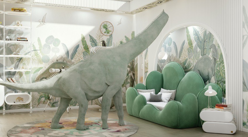 dinaussaurus theme kids' room where the little kids can explore prehistoric environments and make some dinaussaurus friends along the way.