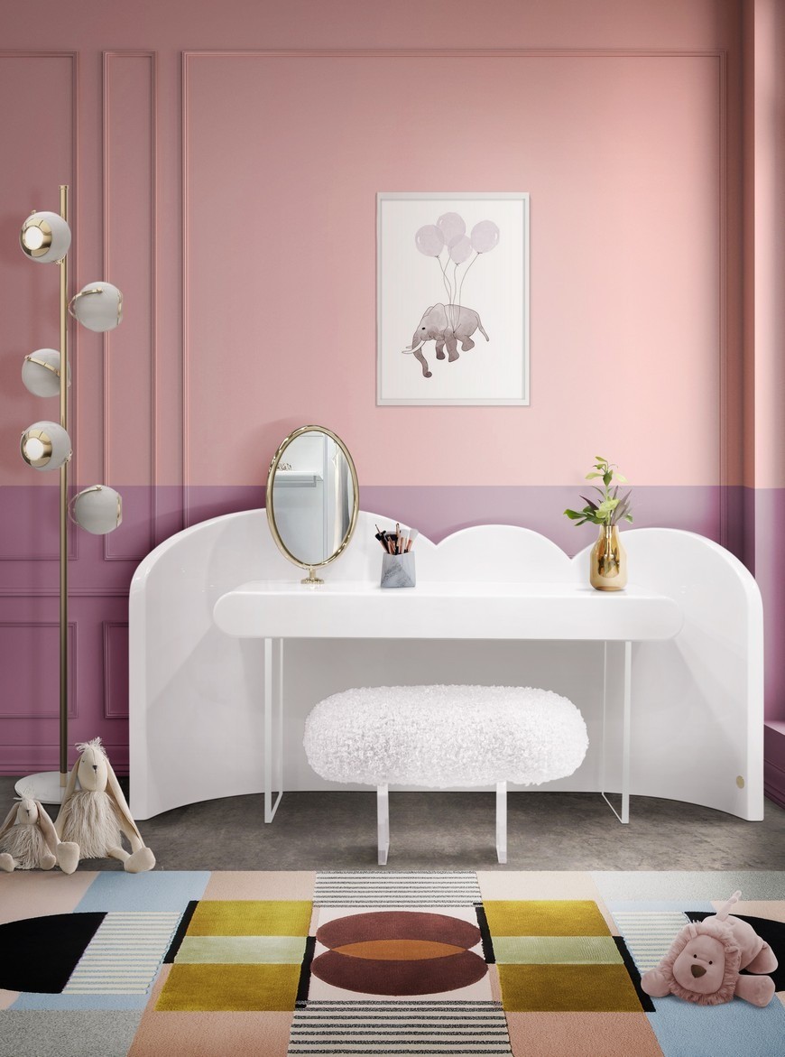 The Cloud Vanity Console is the perfect piece for this girls bedroom corner, as its round shapes reminisce us of the '50s and '60s. This functional piece works wonderfully in girls bedrooms, as it is a great allied in her morning routines, The beauty of both this style and piece is that the girl can grow with it, instead of having to change the whole room in her teens.