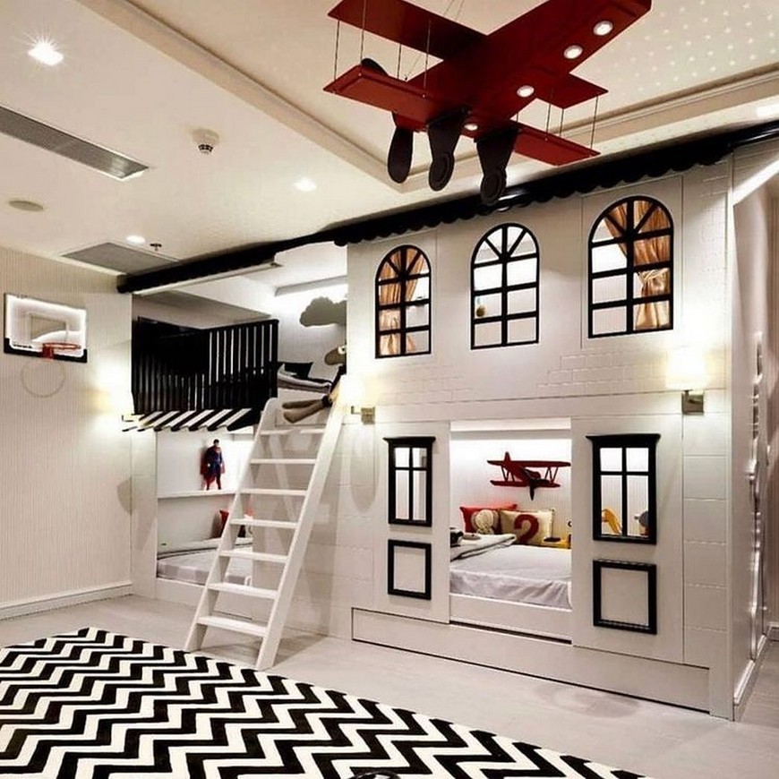 The Patterned rug is a huge thing in this bedroom. Its slick, modern design, mixed with a bold monochromatic contrast adds sophistication and vanguardist details to a bedroom where childishness reigns, adding a sober aura onto which the child can grow with.